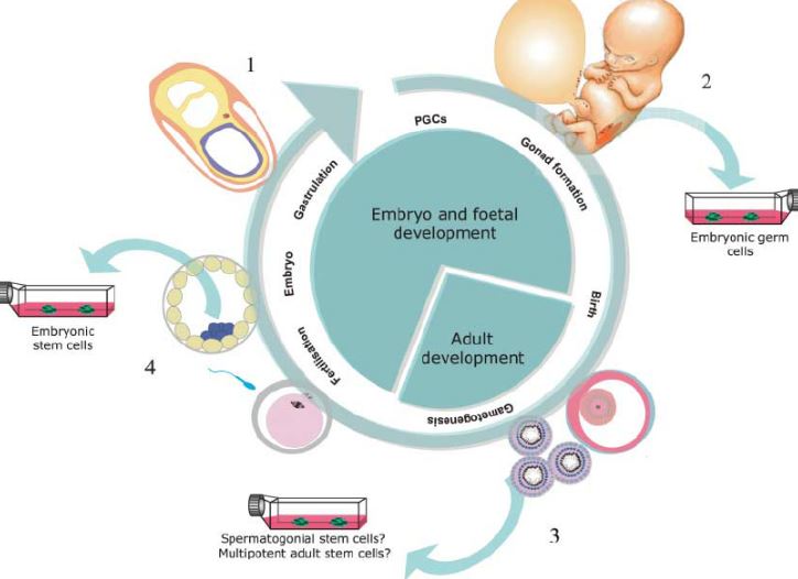 2007 transferred established EBs onto Germline stem cells and mature gametes can be derived in vitro from ovarian granulosa cell monolayer identifying oocyte-like cells within multipotent stem cells other than ESCs. The germ line being the cells in the sexual organs that produce sperm and eggs. Gametes are cells involved in reproduction.